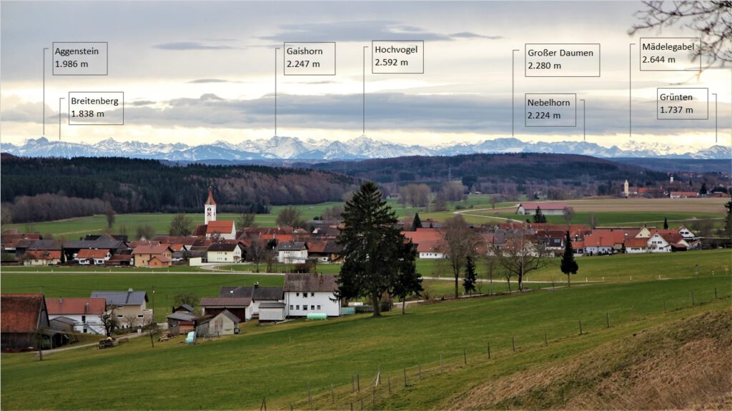 In der Bildmitte befindet sich das Dorf Westernach (Standort der Ferienwohnung). Dahinter beginnt die hügelige Allgäuer Landschaft mit Wäldern und Wiesen. Am Horizont erscheinen die Allgäuer Berge.